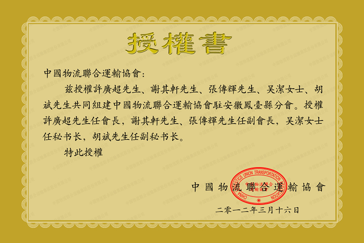 中国物流联合运输协会凤台分会授权书